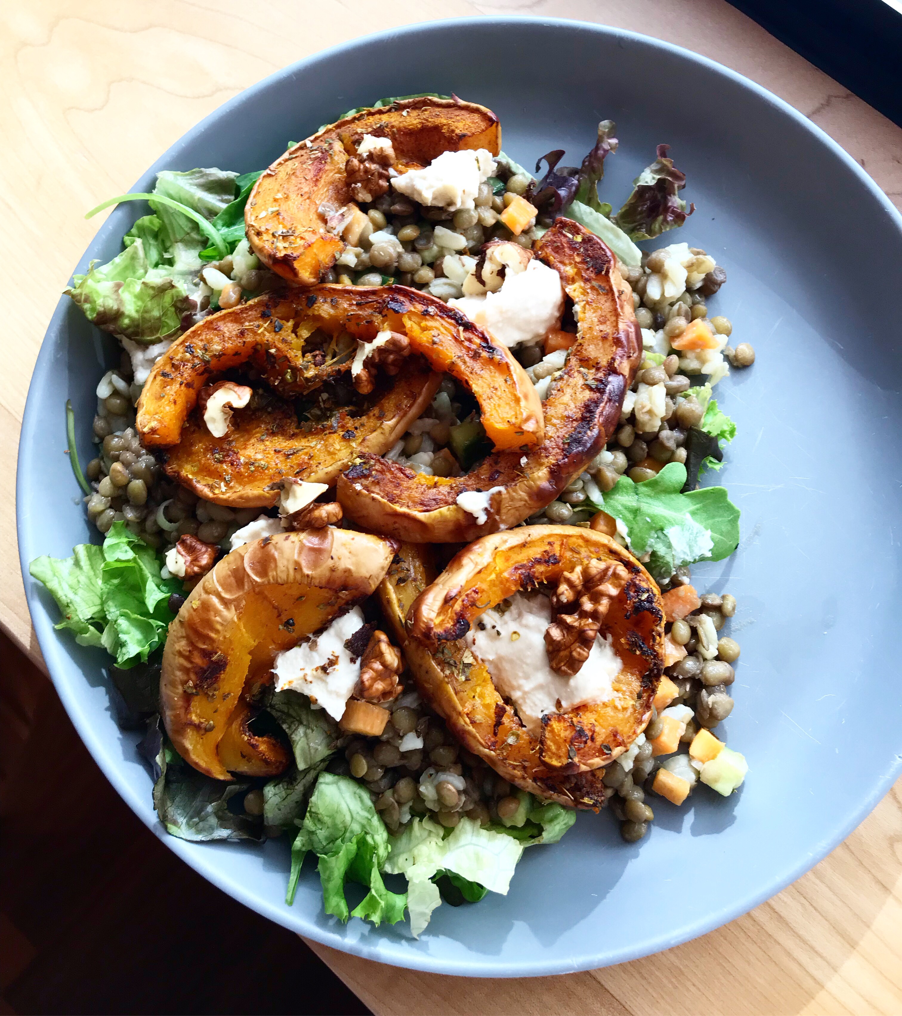 When you’re ready to go, place the leaves onto a plate or in a bowl, add a few heaped spoons of the lentil mix on top followed by the squash. Drizzle with dressing. Add the hummus either in one dollop or smaller spoonfuls across the plate. Finish with toasted walnuts & enjoy!